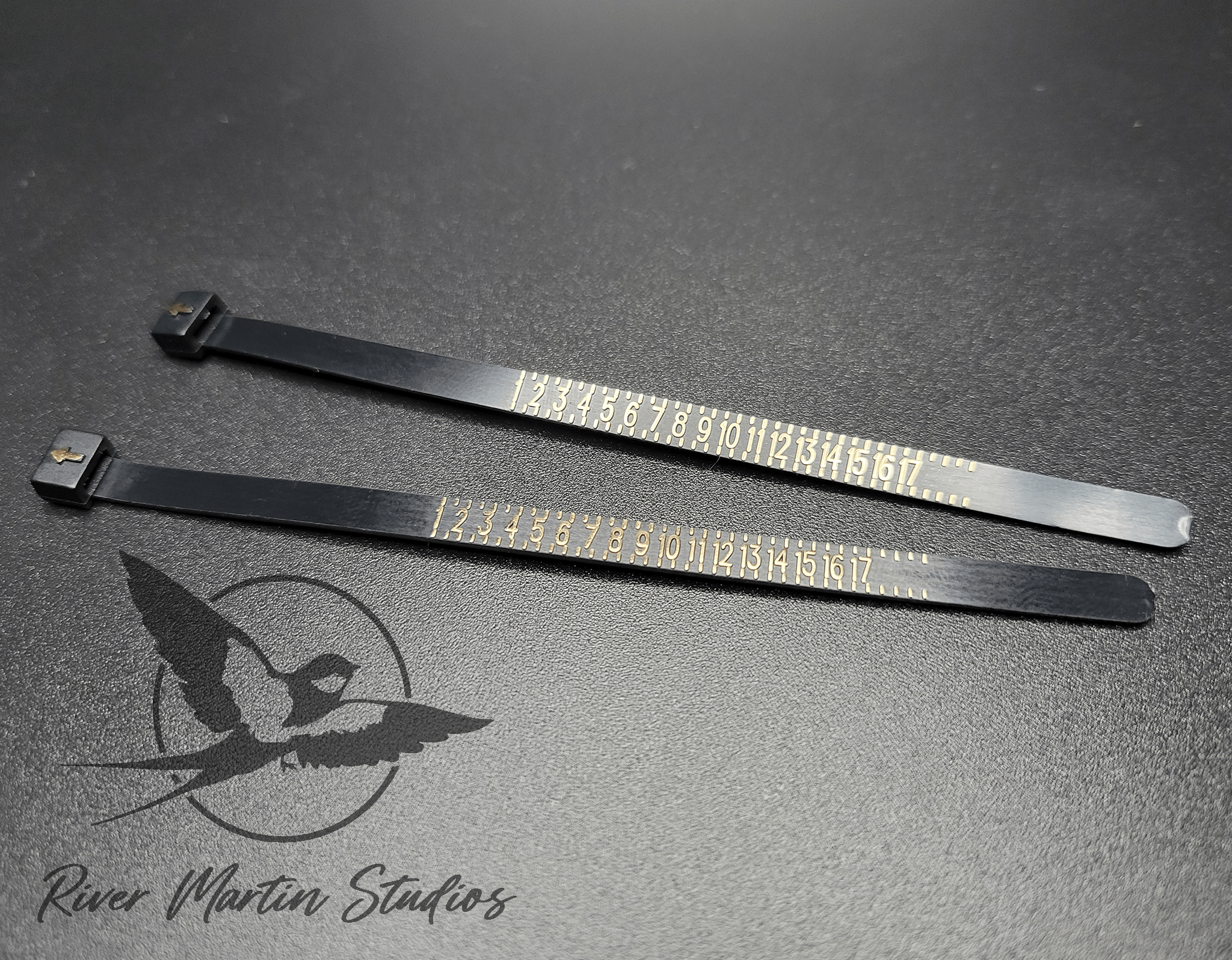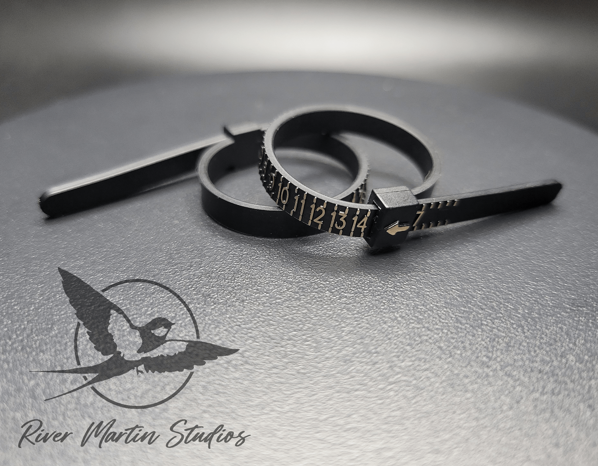 Once you have found the most comfortable size, read what the arrow on the line indicates. The line above the right side of the number indicates a full size, whereas the line on the right side of a number indicates a half size (This can become confusing once you get to size 10 and above). If unsure about reading your sizer, you can email us at rivermartinstudios@gmail.com with a photo of the ring sizer on your finger.